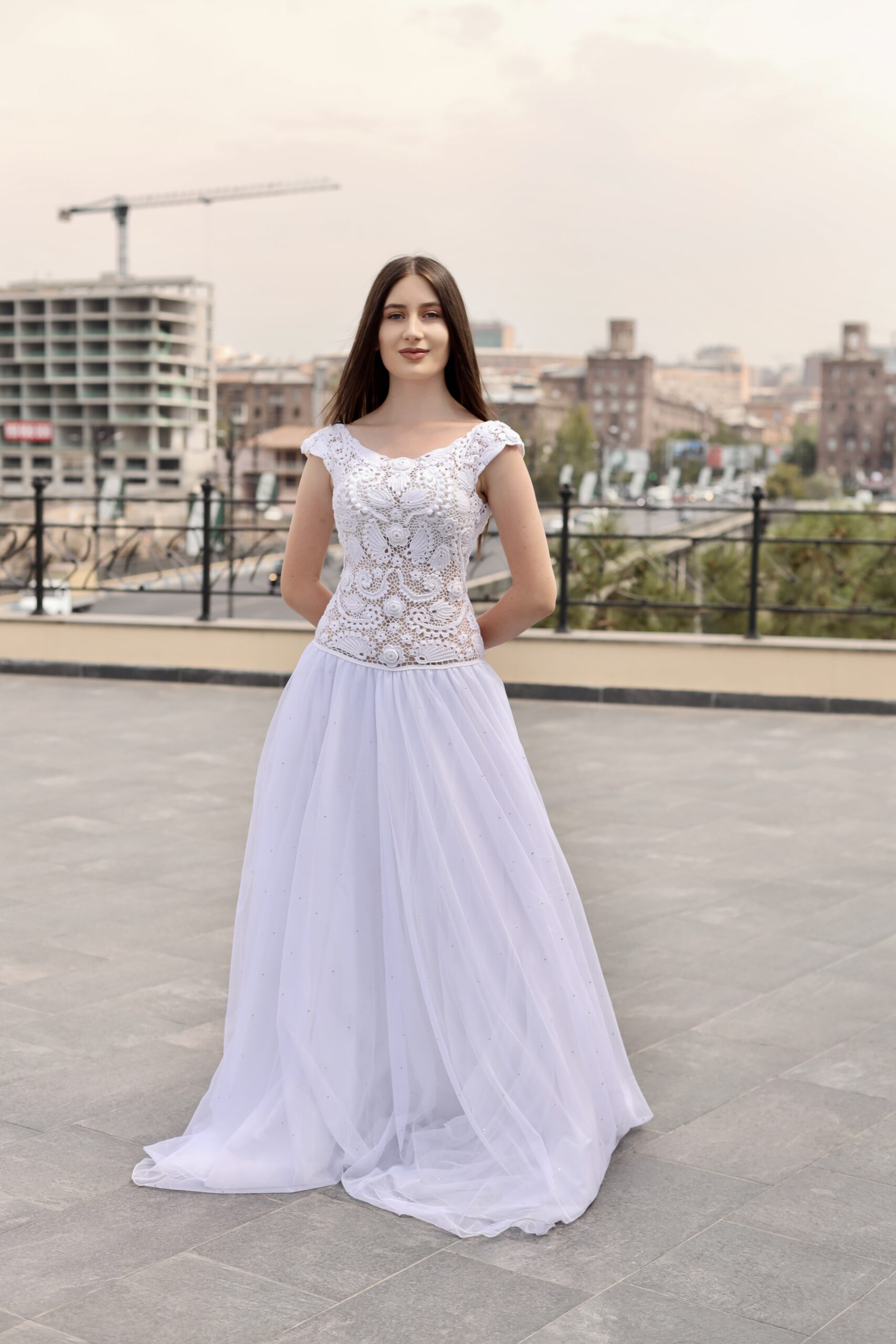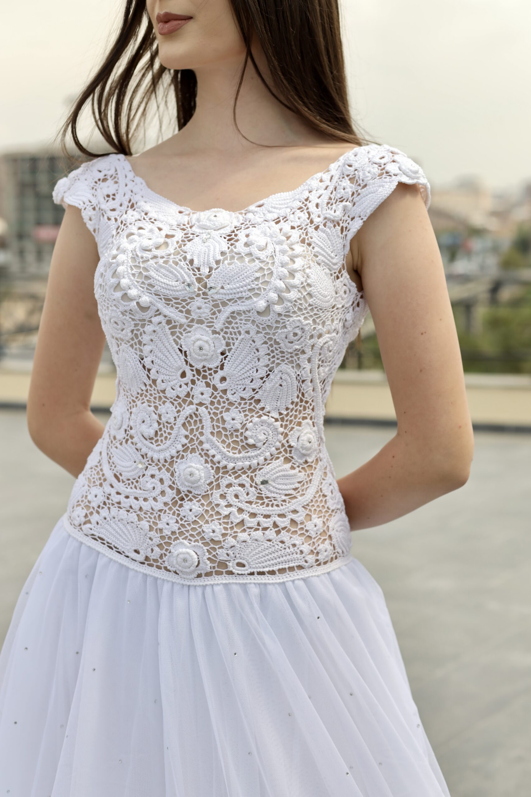 Romantische trouwjurk met Ierse kant van viscosemix in wit. Handgemaakt en uniek (maat M-L).
